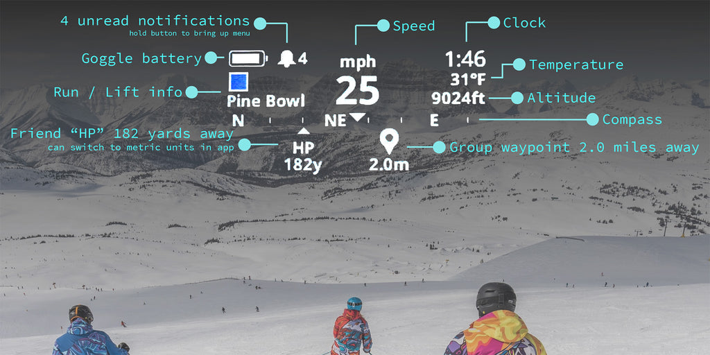 Our integrated Heads Up Display (HUD) shows your speed, elevation, and where your friends are on the mountain in real-time.